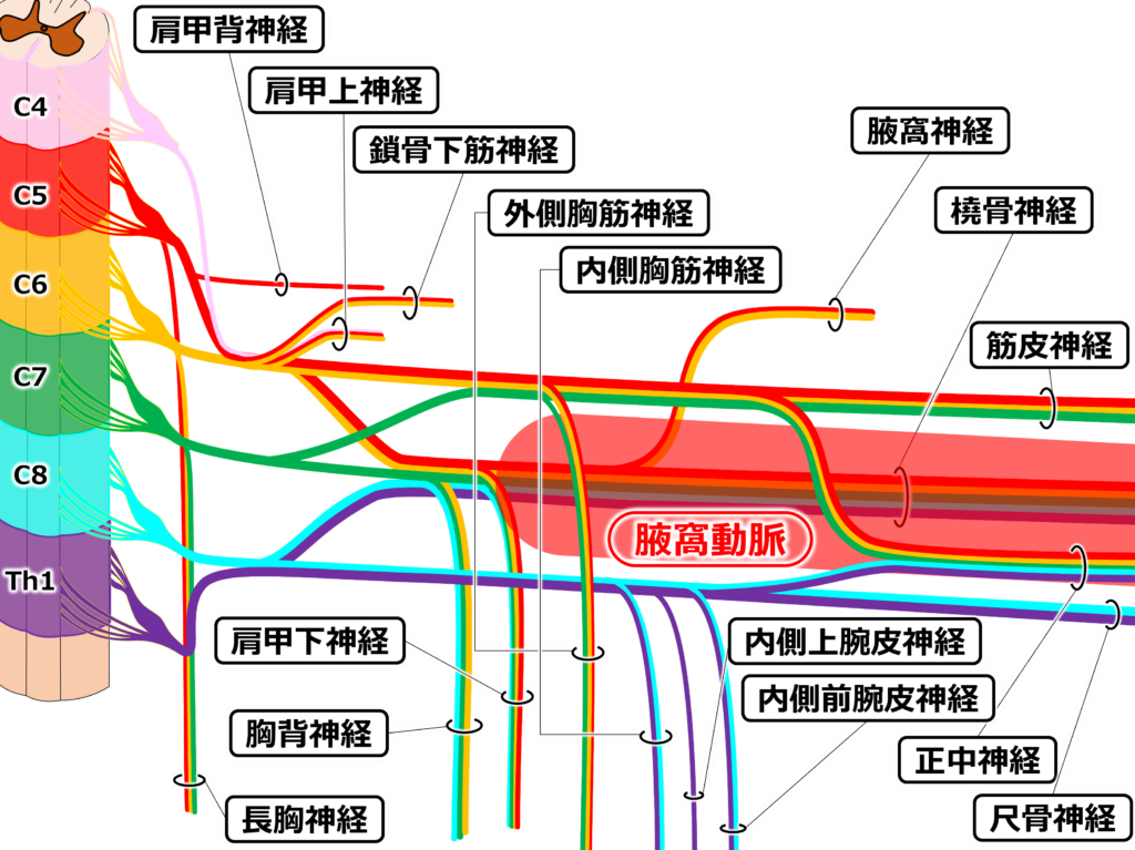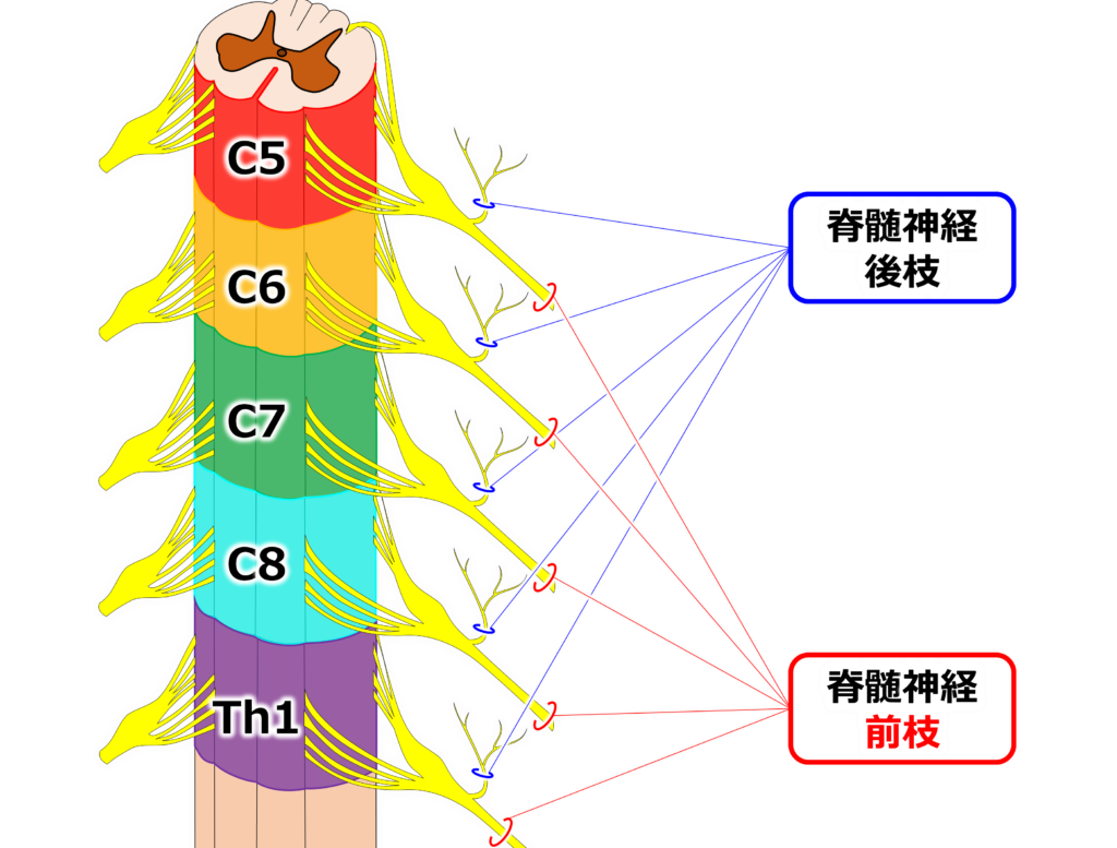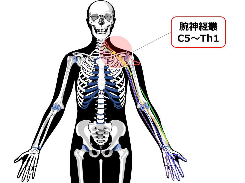 腕神経叢は第5頚神経【C5】~第1胸神経【Th1】の前枝が合わさり作られます。