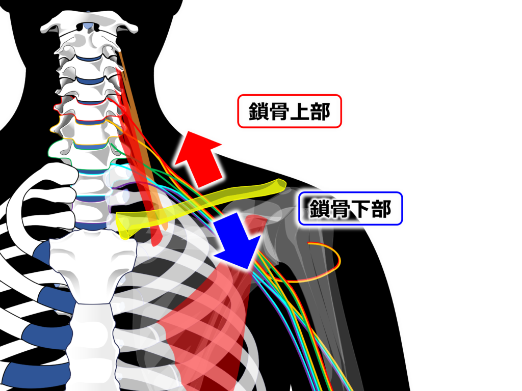 腕神経叢は鎖骨や肩甲骨周囲に分布する【鎖骨上部の枝】と上肢へ分布する【鎖骨下部の枝】に分けられます。
