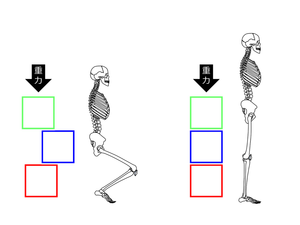 膝がまっすぐに伸びることで重力に対して骨格で支えることが可能となります。