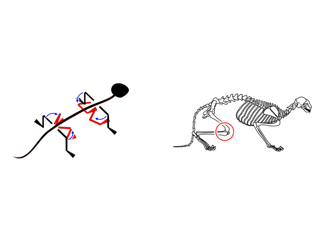 これでは下肢の力を進行方向へ伝えることができないため哺乳類では進行方向へ膝頭が向くようになりました。