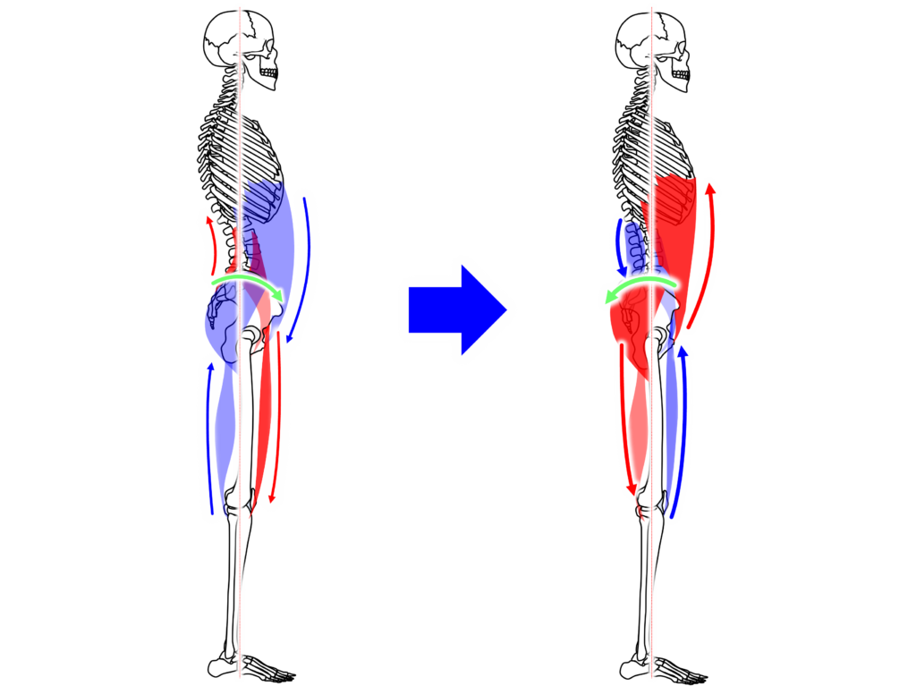 骨盤の前面を上方へ引き上げる腹筋群が伸張し、下方へ引き下げる股関節屈筋群が短縮