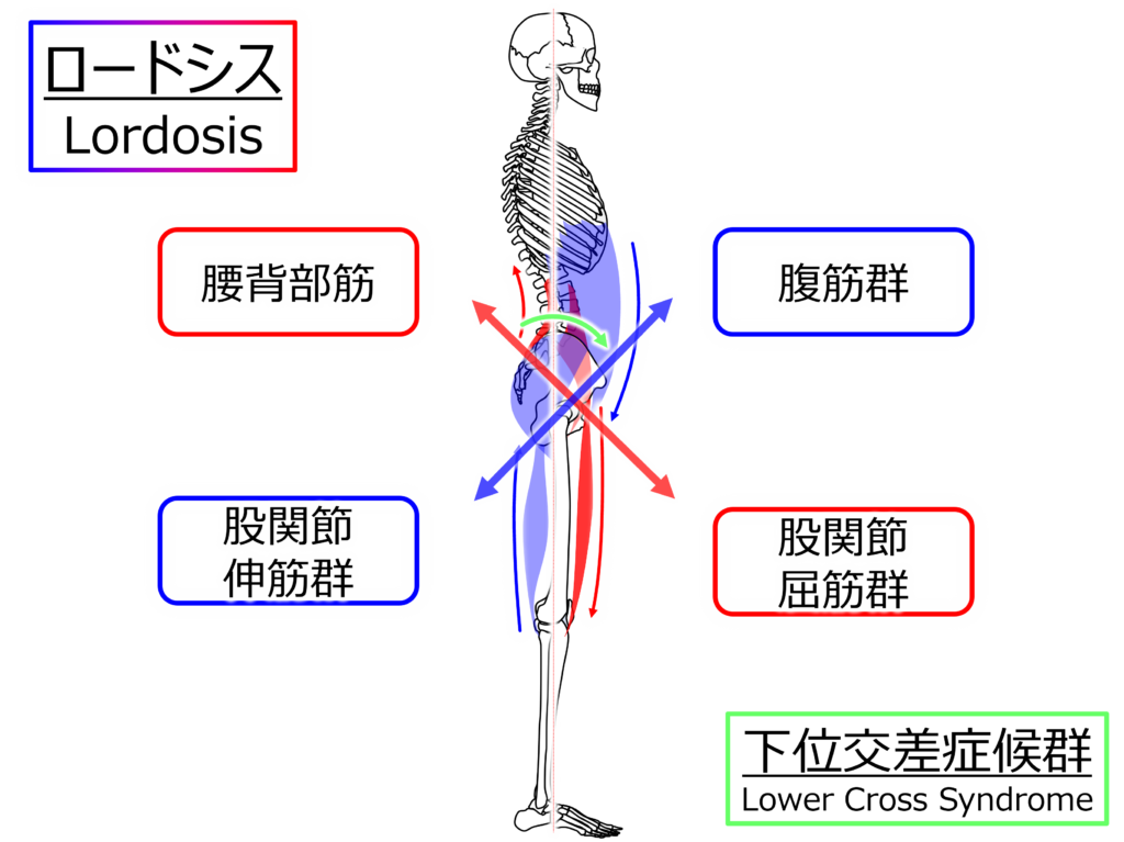 下部体幹で伸ばされている筋と短縮している筋が交差しているように見えるので下位交差症候群タイプA(Lower Cross Syndrome)とも呼ばれます。