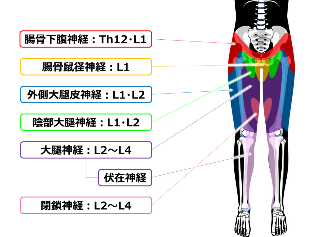 腰神経叢から分布した各末梢神経は固有の皮膚感覚の領域を持っています。