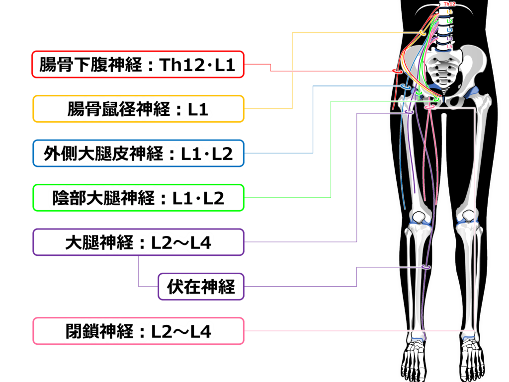 主に腰椎部からの神経の集まりで大腿の伸筋群や大腿前面・内側面、下腿内側面の感覚を支配します。