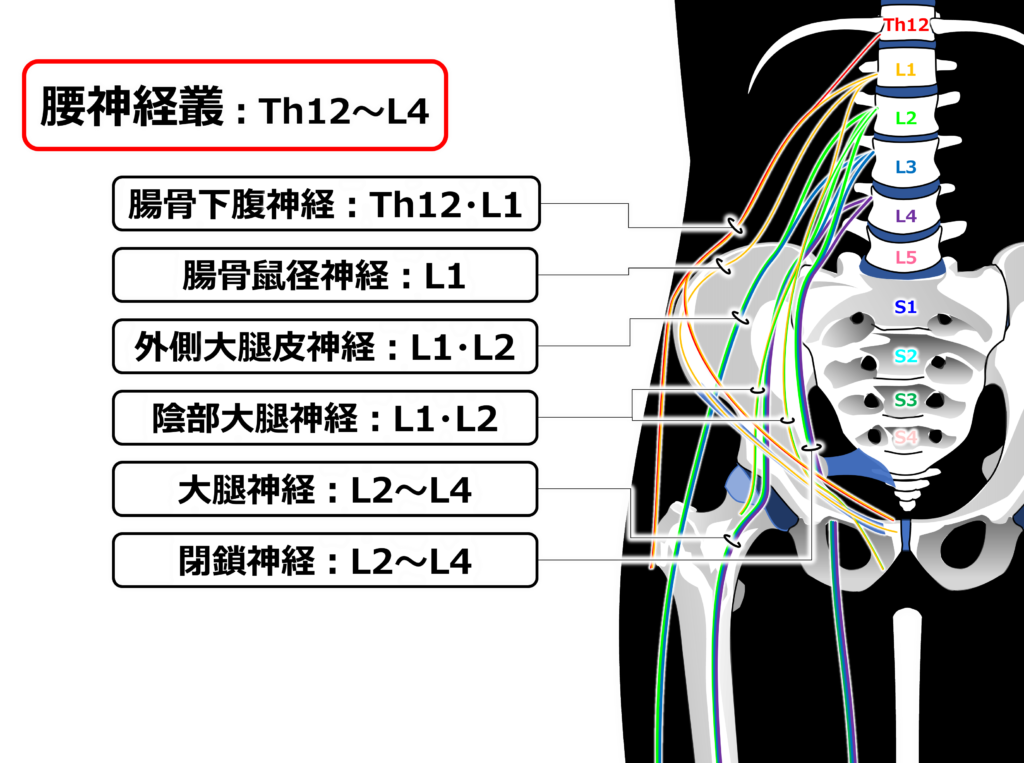 第12胸神経~第4腰神経の前枝からなり、腹筋や大腿前面・内側の筋の運動を支配します。