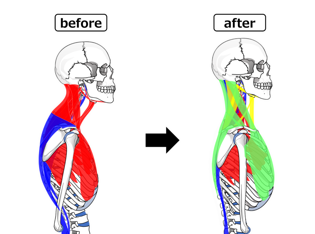 例えば神経を筋肉が硬くなることで圧迫をして症状が出ていたとするなら、その筋肉の柔軟性を改善させ、さらにその筋肉が姿勢の影響で硬くなりやすい状況であれば姿勢や動作などにも介入をしていくという流れになります。