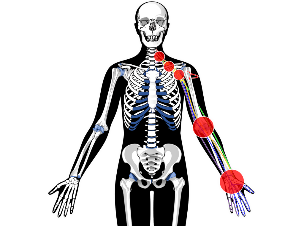特に身体の中でも神経を圧迫や締め付けてしまいやすいポイントがいくつか存在しており、これらの圧迫・絞扼部位を正常な状態に改善できれば症状の軽快・改善も期待ができます。