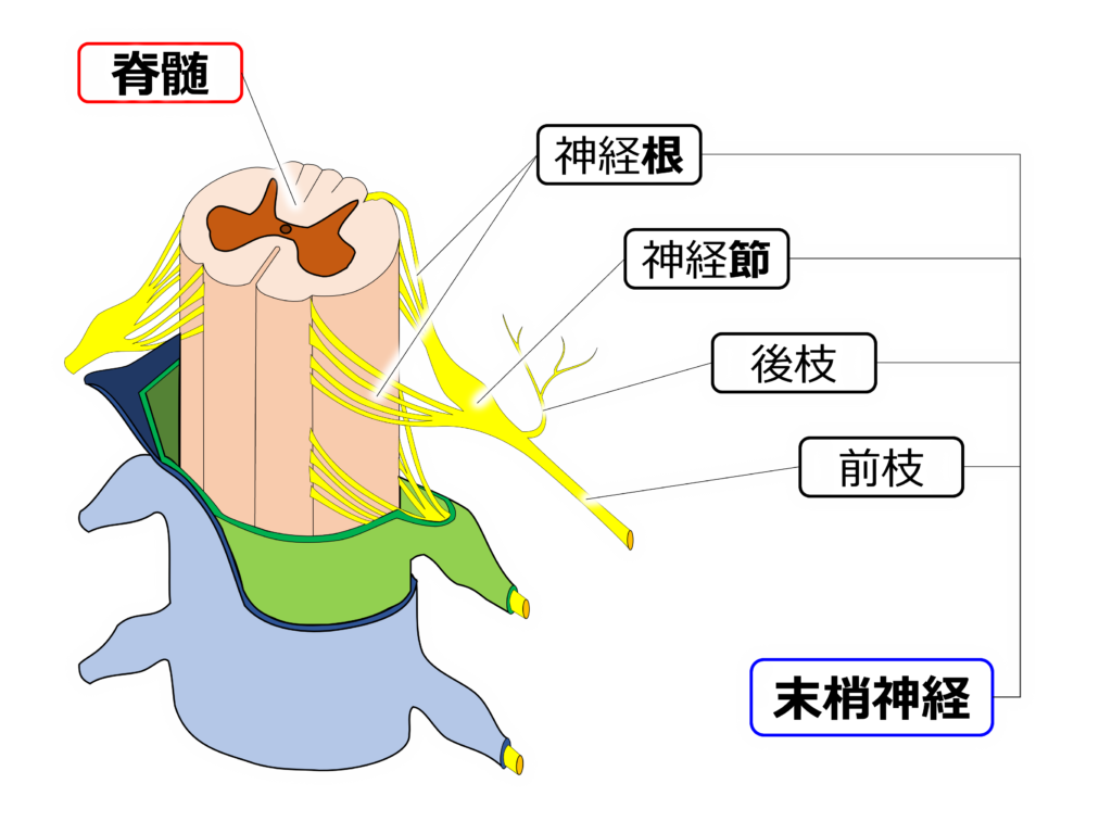 こちらの図は中枢神経の【脊髄】と脊髄から出てきた末梢神経である【脊髄神経】です。