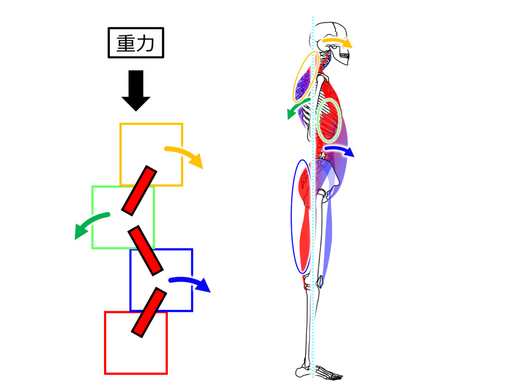 悪い姿勢は模式図で表すと今にも崩れてしまいそうな積み木に例えることができます。