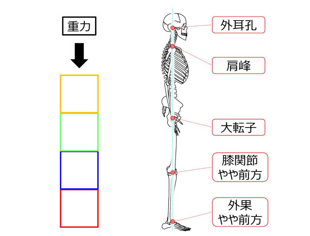 模式図で言うならば積み木がきれいに重なっている状態で、ヒトの身体で言うと【筋】よりも【骨】で身体を支えている状態です。