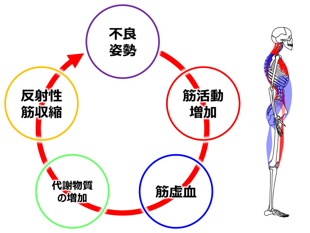 おおよそこの様な負の連鎖が続いて悪い姿勢が定着していくと考えられています。