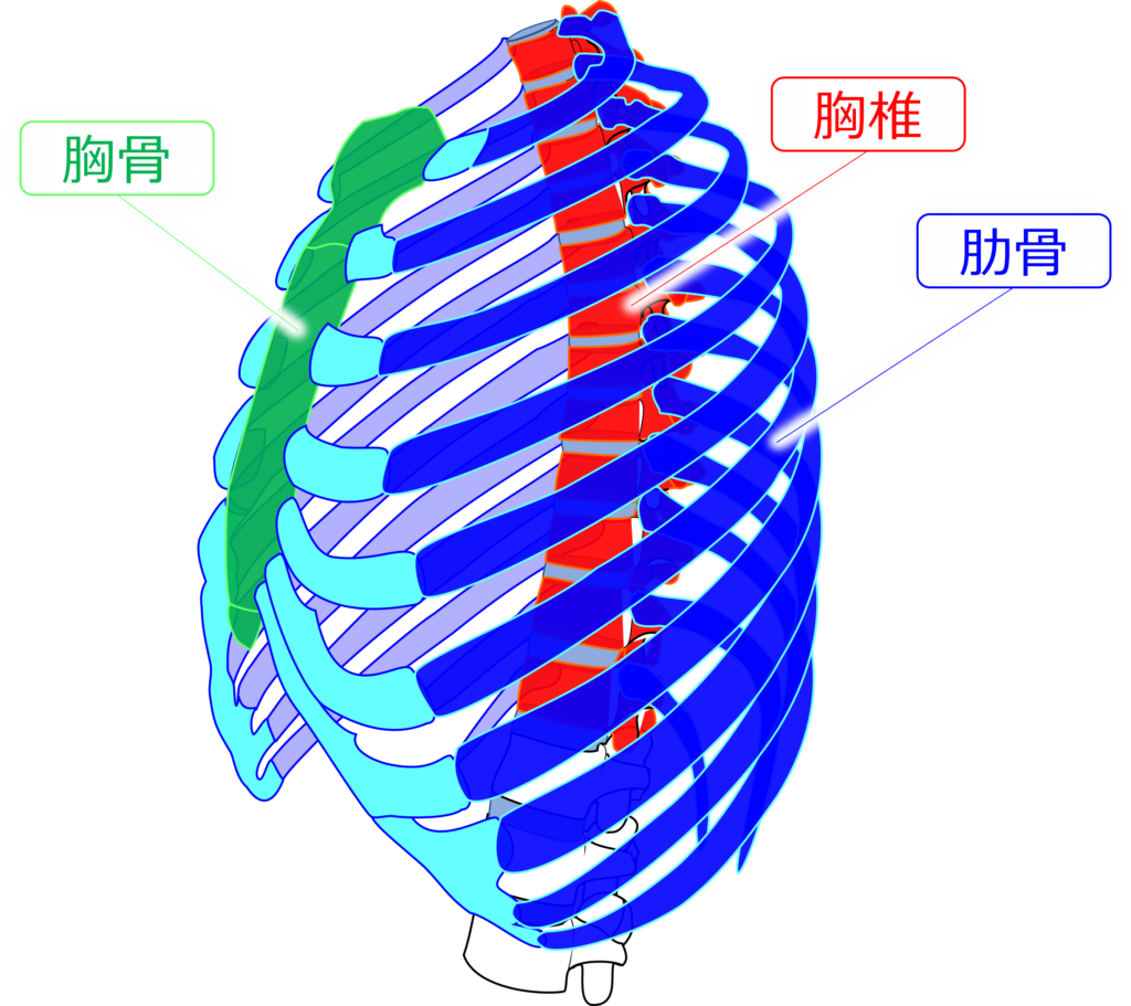 胸郭はヒトの胸部に存在する鳥かご状の骨格です。