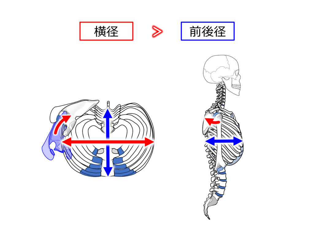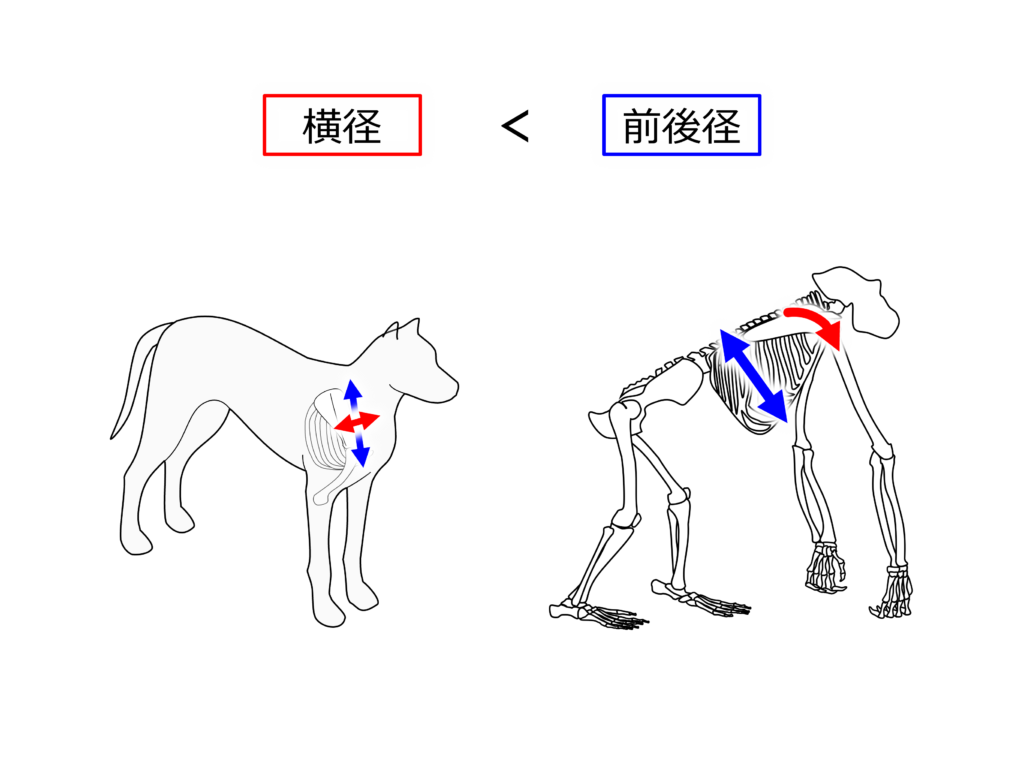 対してヒトの胸郭は前後径よりも横径の方が長い特徴を持ちます。