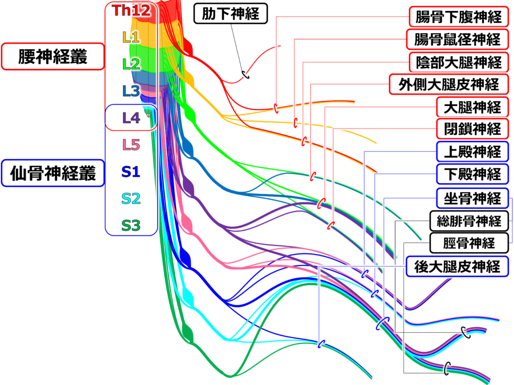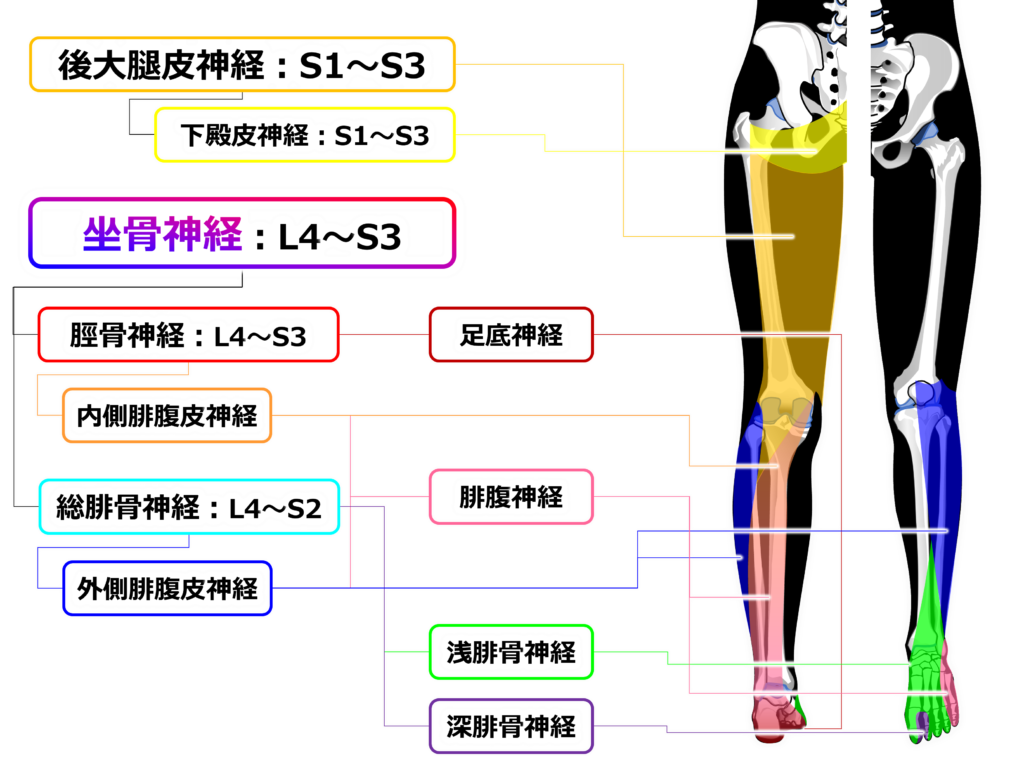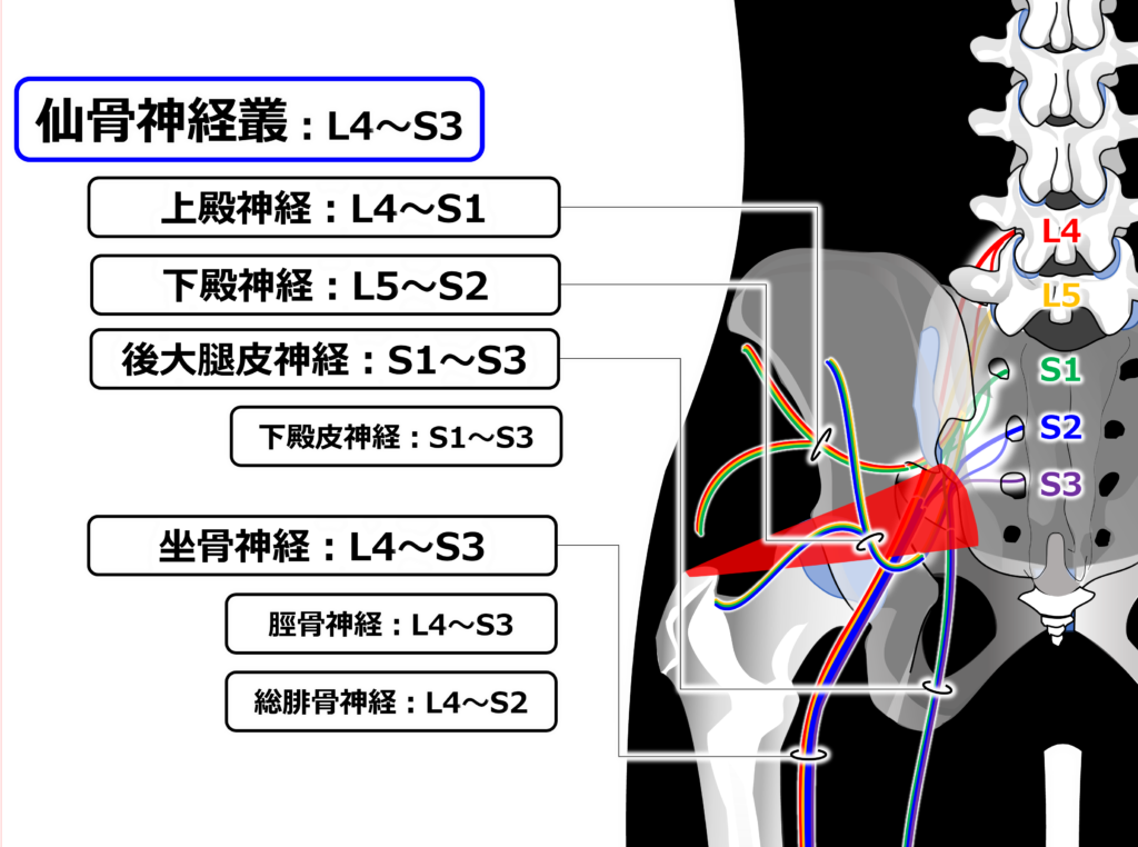 主に仙椎部からの神経の集まりで殿部の筋や大腿の屈筋群、大腿前面・内側面、下腿内側面の感覚を支配します。
