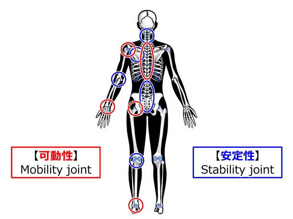 joint by joint Theory:ジョイント バイ ジョイントセオリーとは関節にはそれぞれ【可動性】【安定性】の2つの役割が必要ですが、どちらかというと【可動性を重視した関節】また【安定性を重視した関節】に分けられ、さらにそれらが交互に配列されているという理論です。