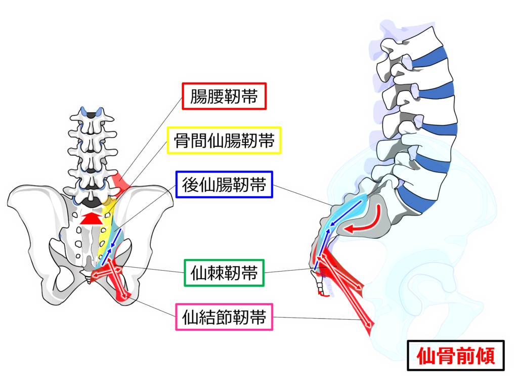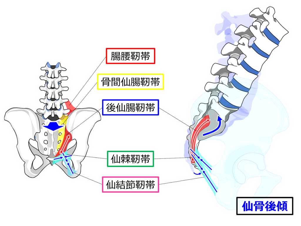 これは骨の構造的なものと靭帯による制動作用によるものが関与し、特にこの仙骨の後傾を制動する靭帯機構が少ないためと考えられています。