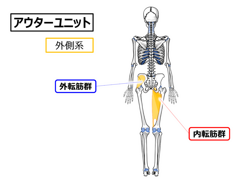 中殿筋や小殿筋といった【外転筋群】と反対側の【内転筋群】からなります。