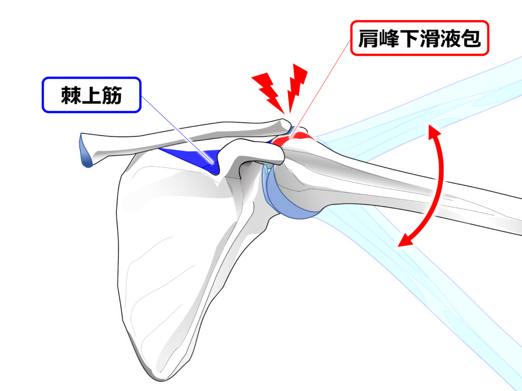 損傷を受けやすい組織としては【肩峰下滑液包】【棘上筋腱】があり、他にも【棘下筋腱】【上腕二頭筋腱】【三角筋滑液包】も挙げられます。