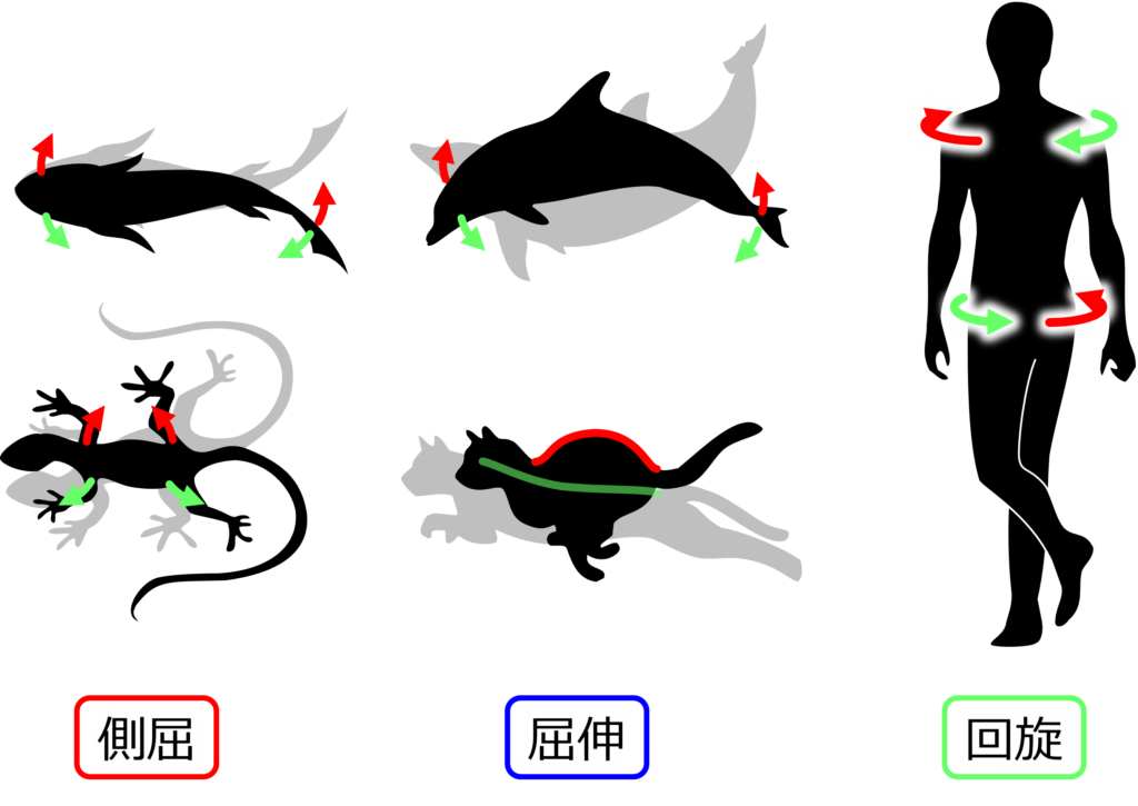 魚類や爬虫類は前方へ進む際に脊柱の側屈で、イルカや四足獣は脊柱の屈伸で推進していきます。
