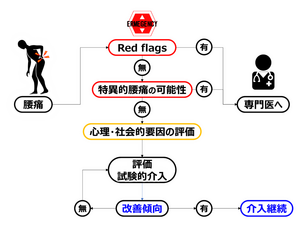 神経症状が認められない、脊柱に明らかな変形がない、仮にあったとしても症状と一致しない場合は非特異的腰痛として対応を進めていきます。