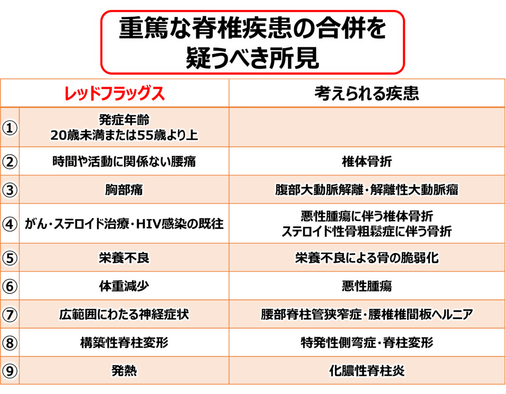 腰痛を伴う重篤な疾患を疑う所見がみられた場合は慎重な評価と専門医の受診をお勧めしております。