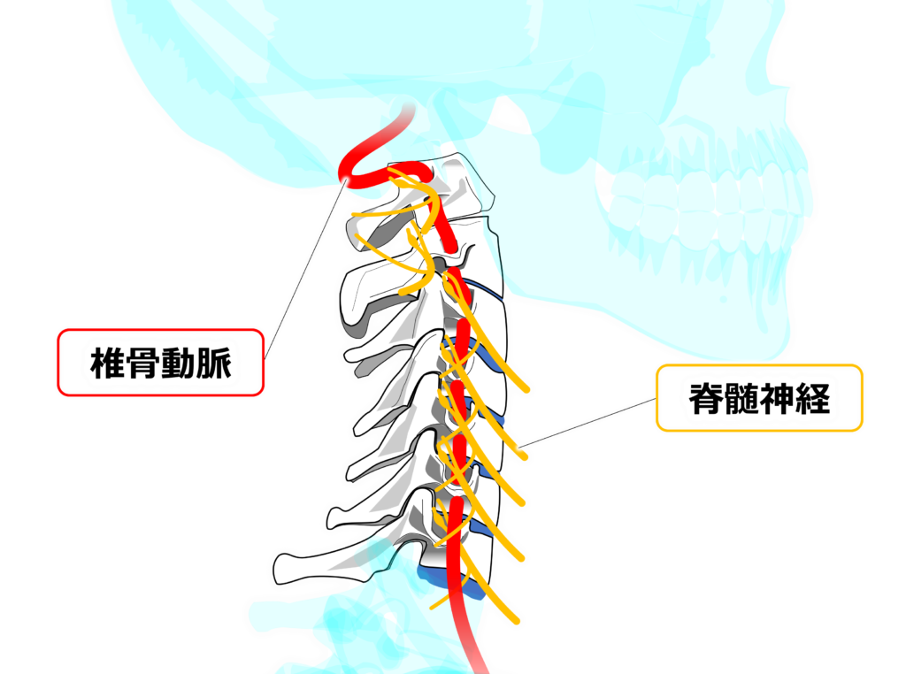 頸椎の変性や位置異常など何らかの影響でこの椎骨動脈が狭窄すると、めまい、眼振、吐気などの症状が生じることがあります。