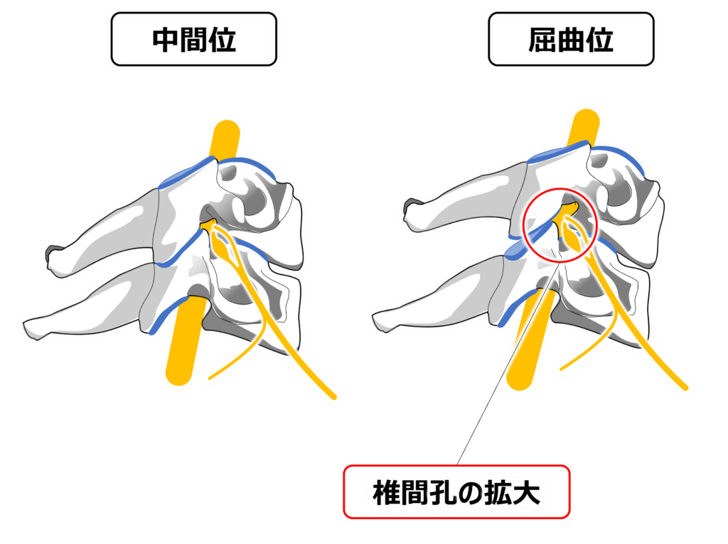 椎間関節の運動によりこの椎間孔は閉じたり開いたりしていますが、椎間関節の変性など何らかの理由で椎間孔の隙間が小さくなると神経を圧迫して肩や腕・手のしびれや運動障害を引き起こすこととなります。