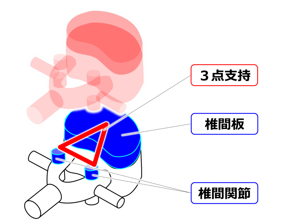 左右の【椎間関節】と前方に位置する【椎間板】の三点により頭部を支え、動的な安定の中で運動を円滑に行えるようにしています。
