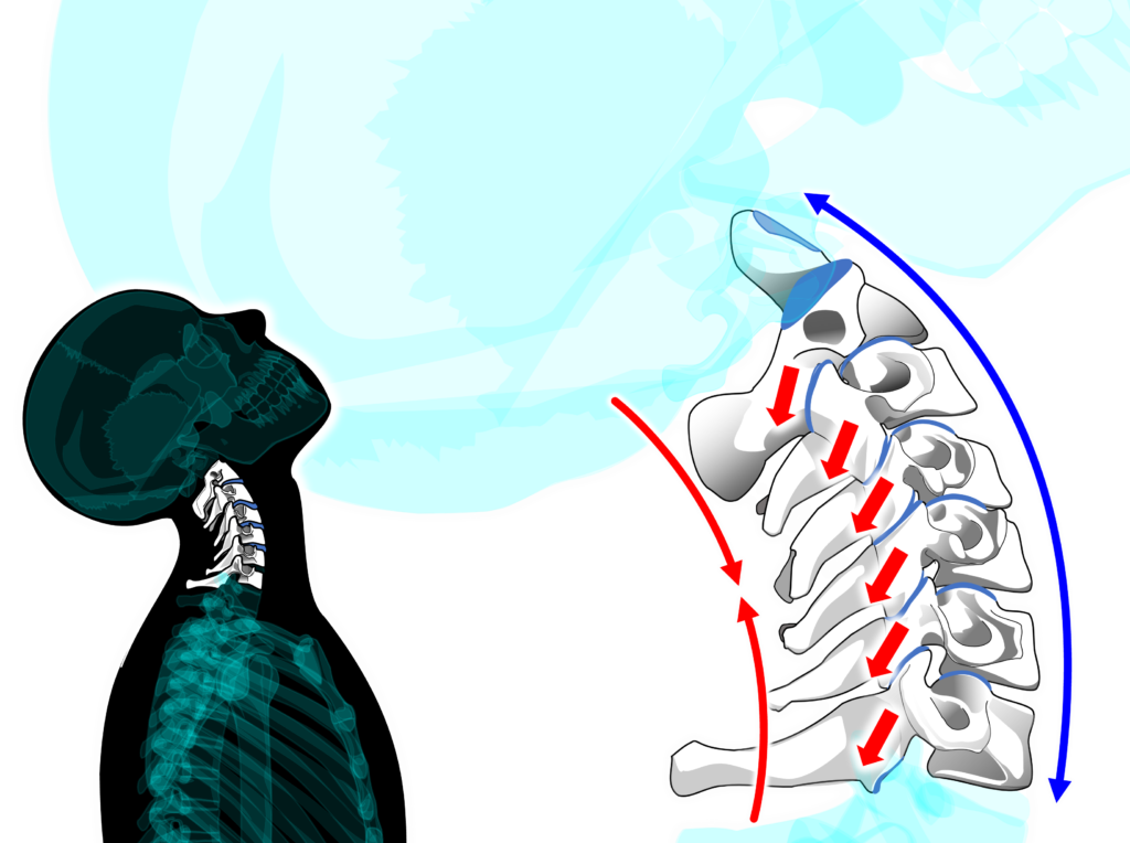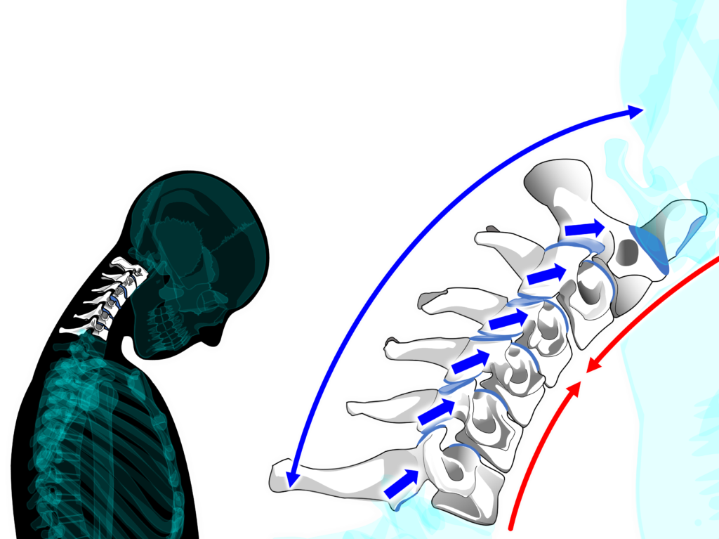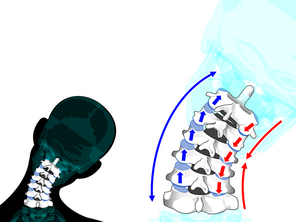 頸椎の屈曲に際して【環椎後頭関節】は【凹凸の法則】に従って後頭顆が環椎に対して前方に回転し、後頭顆が後方へ滑ります。