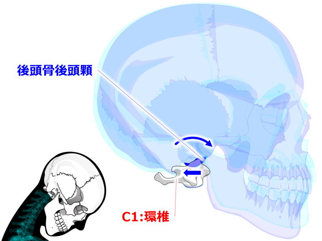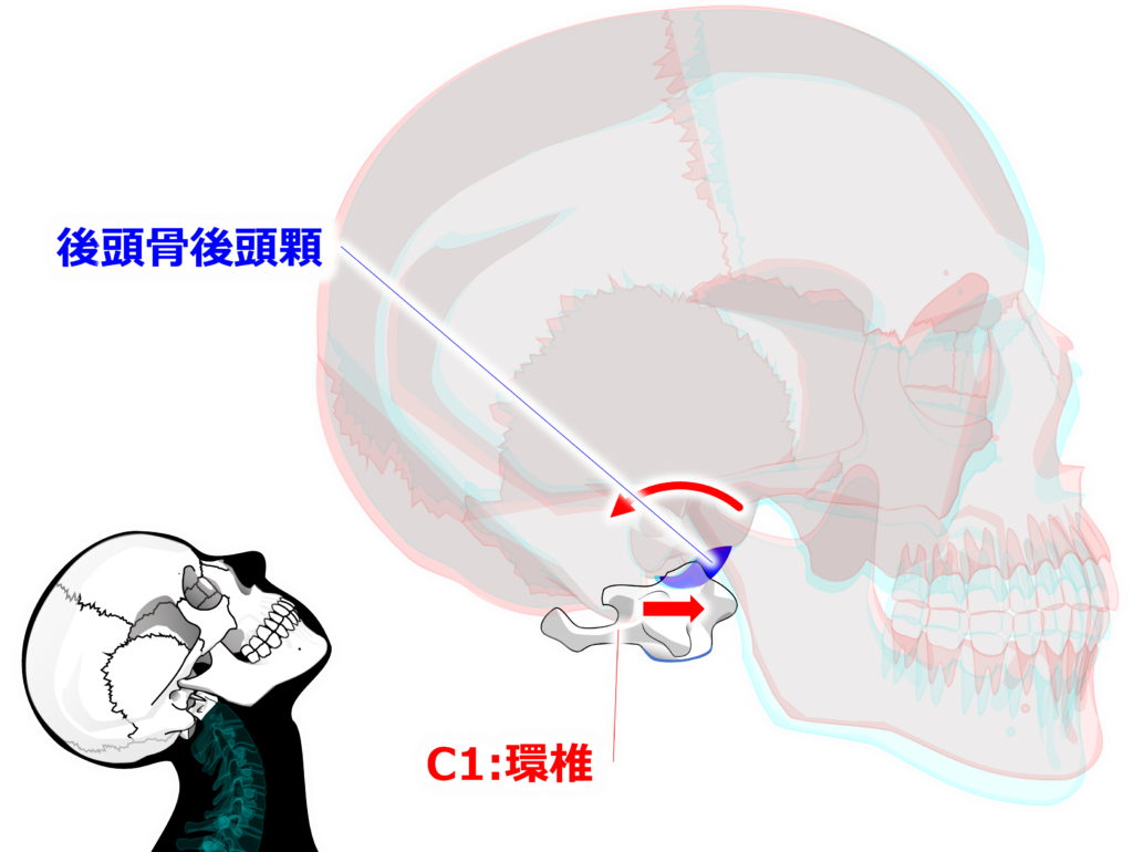 頸椎の伸展に際して【環椎後頭関節】は【凹凸の法則】に従って後頭顆が環椎に対して後方に回転し、後頭顆が前方へ滑ります。