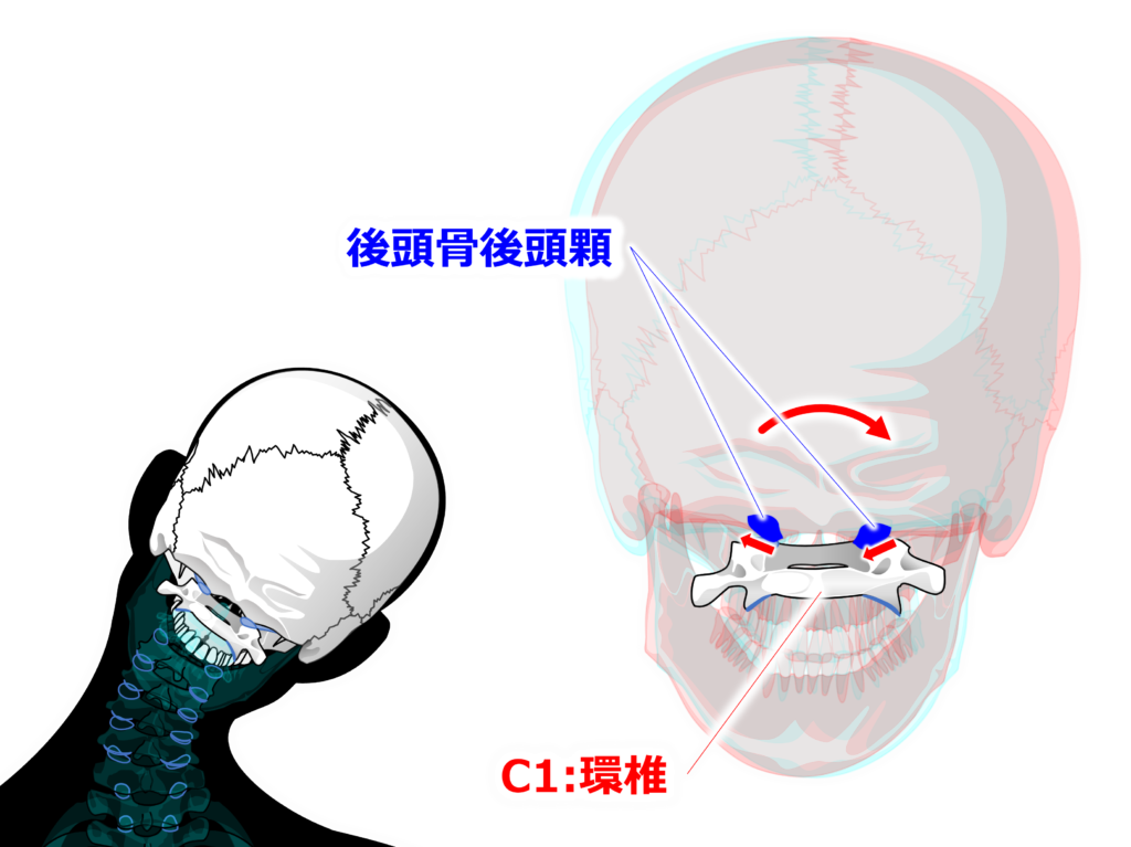 頸椎の側屈に際して【環椎後頭関節】は【凹凸の法則】に従って後頭顆が環椎に対して側方に回転し、後頭顆が側屈方向の反対へ滑ります。