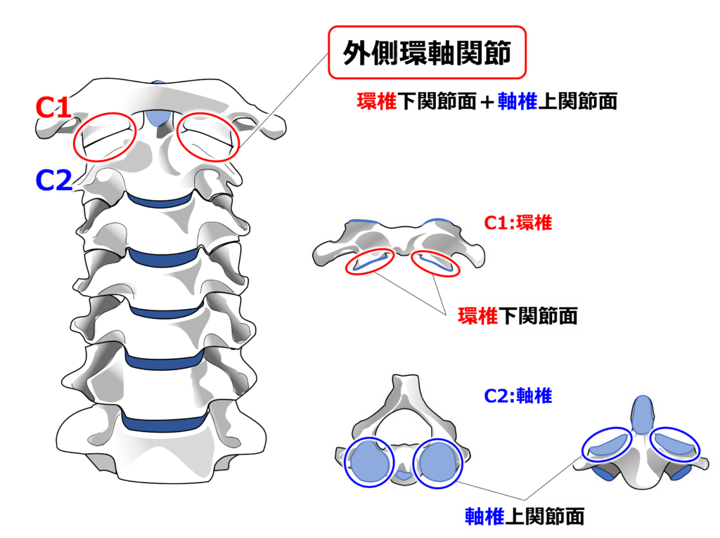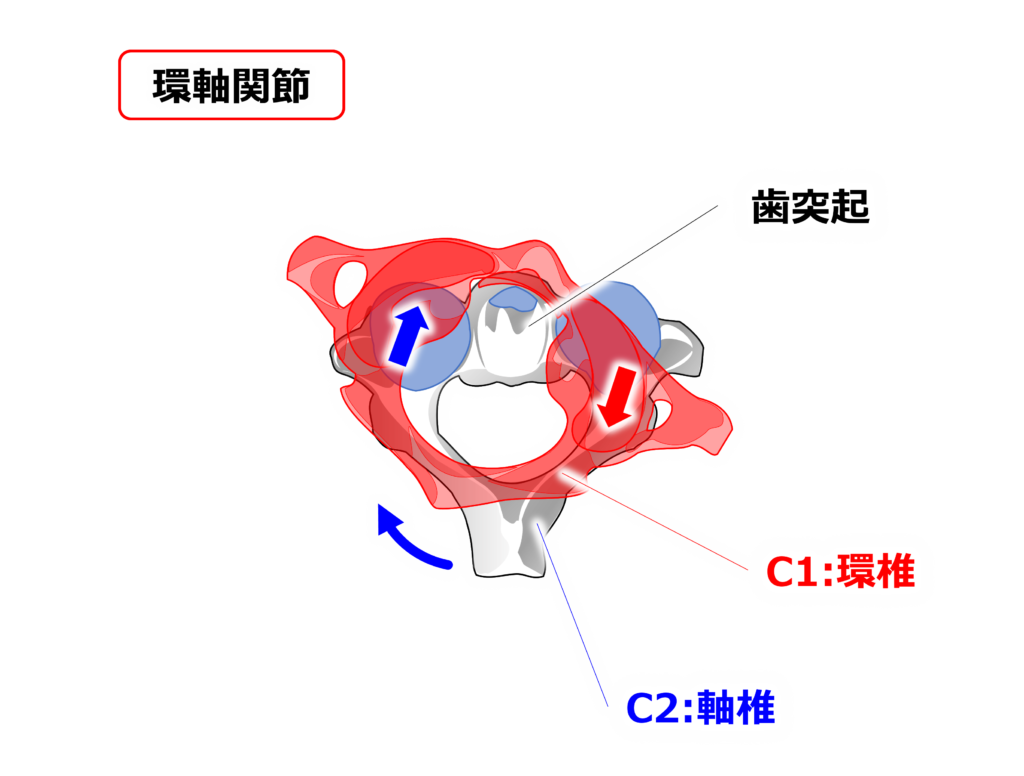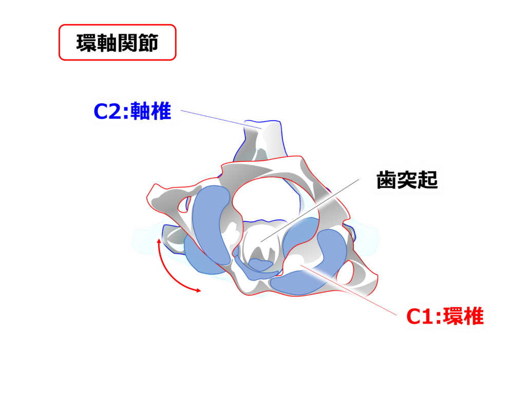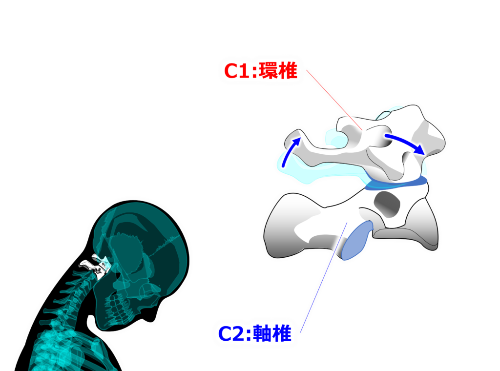 【正中環軸関節】と【外側環軸関節】で構成され、頭部の回旋に大きく関わってきます。