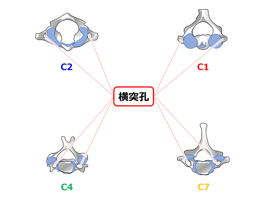 頸椎の横突起には【横突孔】という孔が開いており、ここを椎骨動・静脈が通過します。