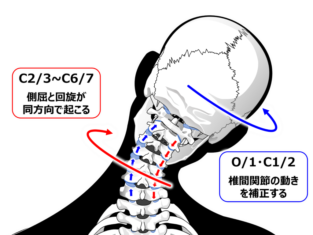 そのため顔を正面に向けつつ側屈するためには上位頸椎が反対側へ回旋する必要があります。